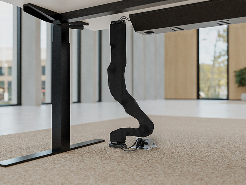 Die Mesh+ Kabelführung von Adapt ordnet die Strom- und Datenzuführung an höhenverstellbaren Schreibtischen vom Boden bis zur Stehhöhe. Mesh+ fasst große Mengen an Kabeln in einem flexiblen Schlauch aus Netzgewebe zusammen und führt sie vom Kabelkorb oder der Tischplatte bis zum Boden.